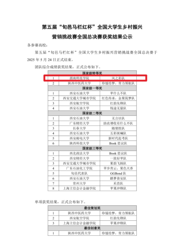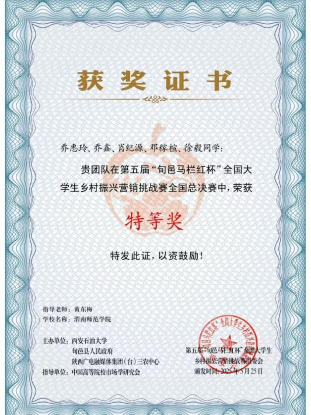 据悉,第五届“旬邑马栏红杯”全国大学生乡村振兴营销挑战赛总决赛由西安石油大学、旬邑县人民政府、质农爱购平台联合主办,中国高等院校市场学研究会作为赛事指导单位。本届大赛吸引了全国35所高校的137支队伍参赛。经过四个多月的激烈角逐,最终20支队伍脱颖而出。“旬邑马栏红杯”全国大学生乡村振兴营销挑战赛以赛促学、以学促产,不仅为青年学子提供了实践舞台,更为革命老区产业振兴注入了青春动能。赛事将继续深化校地合作,推动更多创新成果落地生根,让“马栏红”品牌在新时代绽放更加璀璨的光芒!(通讯员 黄东梅 审核 袁梁)