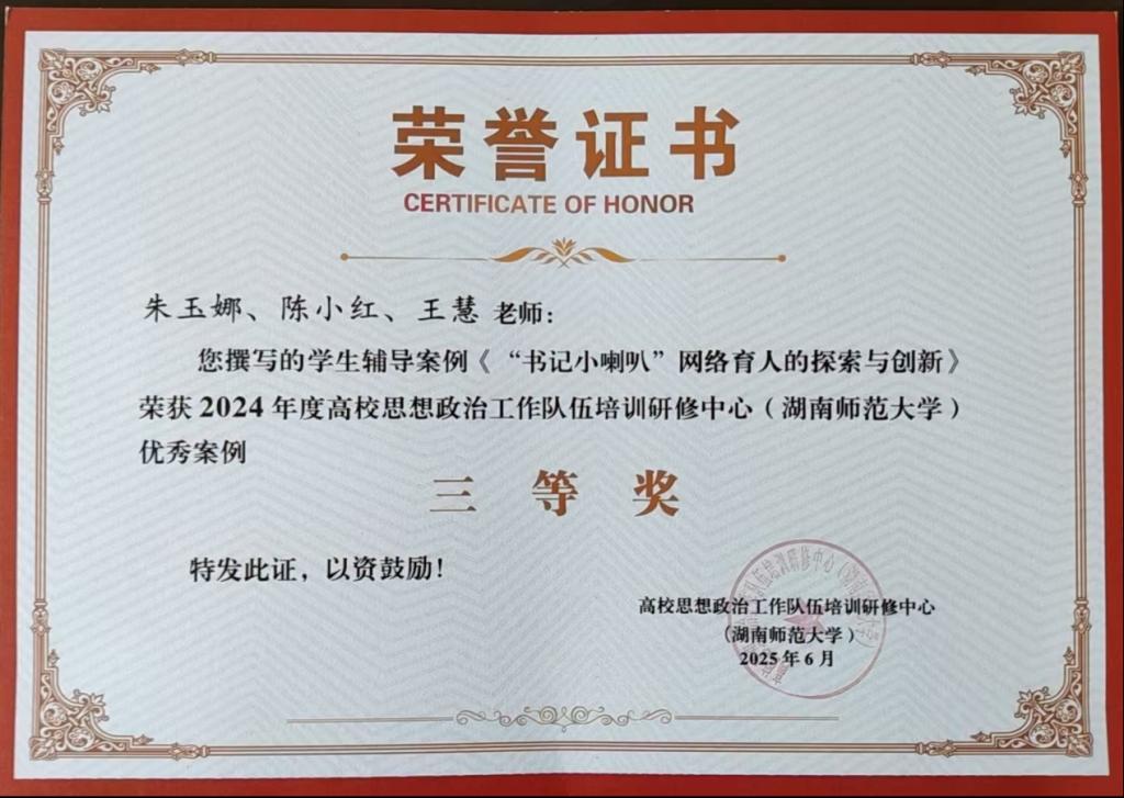 日前,由纽约国际官网教师朱玉娜、陈小红、王慧申报的学生辅导案例《“书记小喇叭”网络育人的探索与创新》荣获2024年高校思想政治工作队伍培训研修中心(湖南师范大学)优秀案例三等奖。