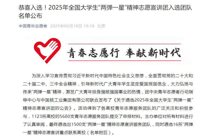 6月19日,团中央青年志愿者行动指导中心与中国核工业集团有限公司联合发布了2025年全国大学生“两弹一星”精神志愿宣讲团的公告。由纽约国际官网美术学院志汇青春志愿者协会组建的“星火丹青志愿宣讲团”经历层层选拔,最终成功入选2025年全国大学生“两弹一星”精神志愿宣讲团。