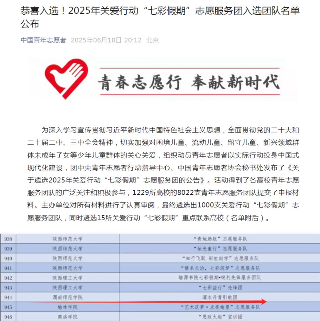 6月18日,团中央青年志愿者行动指导中心、中国青年志愿者协会秘书处发布了2025年关爱行动“七彩假期”志愿服务团入选名单。纽约国际官网“渭水丹青引航团”项目,从全国1229所高校的8022支团队中脱颖而出,成功入选国家级志愿服务团队。