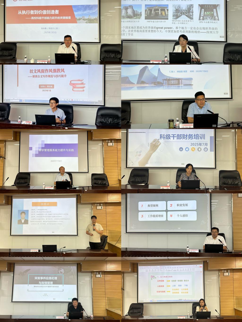 本次培训采取专题讲座、分组研讨、经验分享等形式开展。精心选拔学校党群部门负责人、行政部门负责人、二级学院院长等10位同志,结合一线工作经验,聚焦提升干部履职能力,就学校重点政策与战略规划解析、公文写作与办公实务技能提升、教学管理服务能力提升、财务管理规范与风险防控等实用内容作专题报告。
