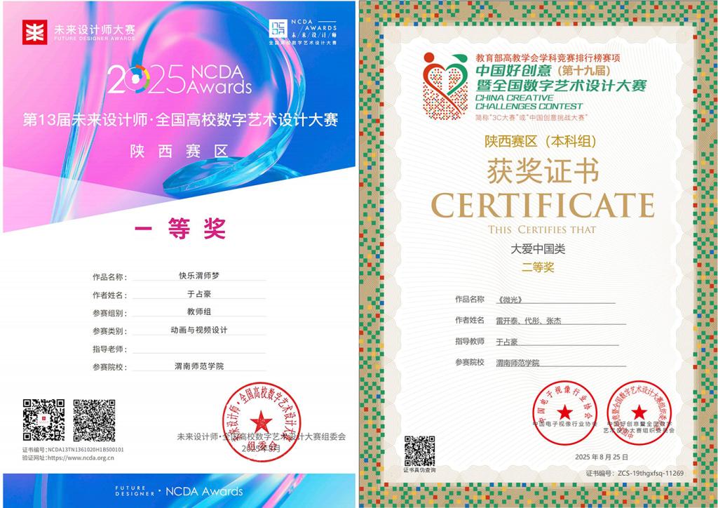 未来设计师・全国高校数字艺术设计大赛(NCDA)、中国好创意暨全国数字艺术设计大赛两项比赛作为全国性高校数字艺术设计领域的重要赛事,入选《全国普通高校学科竞赛排行榜》,旨在搭建高校数字艺术设计教学成果展示平台,激发学生创新思维与实践能力,推动数字艺术设计行业的发展与人才培养。本次获奖不仅是计算机学院师生扎实专业技能的成果体现,更是学院教学实力与人才培养模式的集中体现。通过“以赛促学、以赛促教、以赛促创” 教学理念,有序组织学生参与竞赛,有效夯实学生的专业知识与技能,鼓励师生将专业知识与文化传承、社会需求相结合,打造具有思想性、艺术性与实用性的优秀作品。(通讯员 于占豪 审核人 杨方琦)