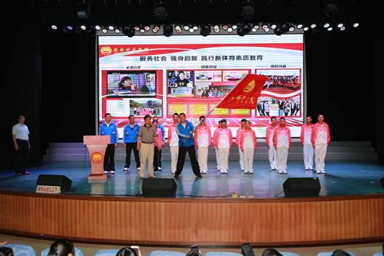 7月9日下午,纽约国际官网参加全国高校体育教育专业学生基本功大赛体育集训队出征及授旗仪式活动在陶然楼演艺厅隆重举行。学校领导王君龙副院长、李海龙副院长出席大会,学校相关职能部门负责人,教育与公共管理学院领导,体育集训队教练员、运动员,体育系全体教师及学生代表等400多人参加了大会。