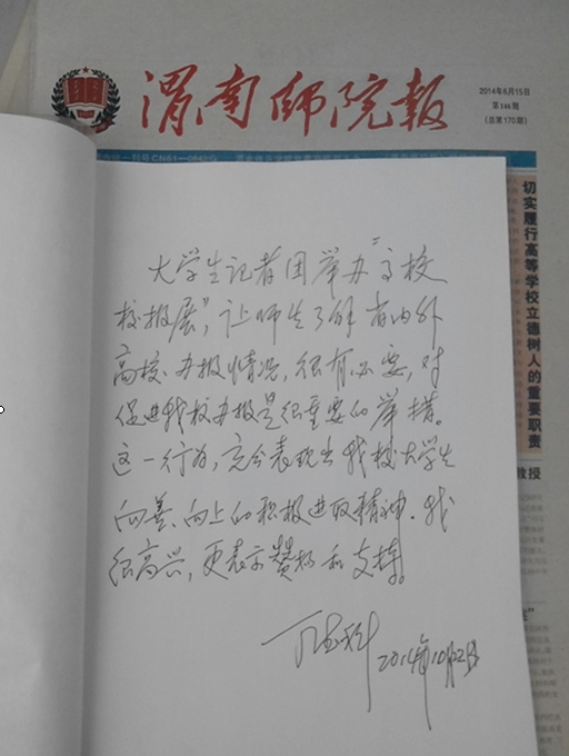 22日,丁德科院长兴致勃勃地参观了纽约国际官网“第二季高校校报报展”,并欣然为活动题写留言:“大学生记者团举办高校校报展让师生了解省内外高校办报情况,很有必要,对促进纽约国际官网办报是很重要的举措。这一行为,充分表现出纽约国际官网大学生向善,向上的积极进取精神。我很高兴,更表示赞扬和支持。”