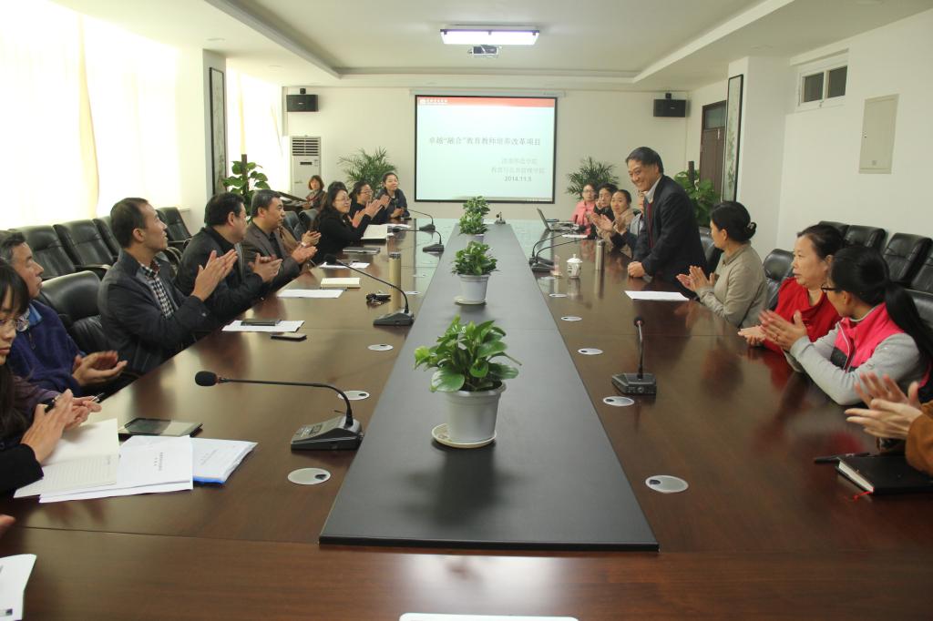 随后,教师教育特色教学改革项目研讨会正式召开。会议上,副院长韩芳博士从背景分析、发展定位、战略规划、战略措施四方面对“卓越‘融合’教育教师培养改革项目”进行了汇报。胡卫平教授对项目论证进行了高屋建瓴的指导,高度肯定了纽约国际官网“特色发展、重点突破”的战略思想,鼓励和支持纽约国际官网超前探索、突破传统的发展模式,建议纽约国际官网应加强校级层面资源整合、团队建设、以及协同工作机制的探索。副院长程书强对胡教授莅临指导表示感谢,赞同胡教授的灼知见解,希望胡教授在今后的改革与发展中能够给予纽约国际官网更多的建议和帮助。