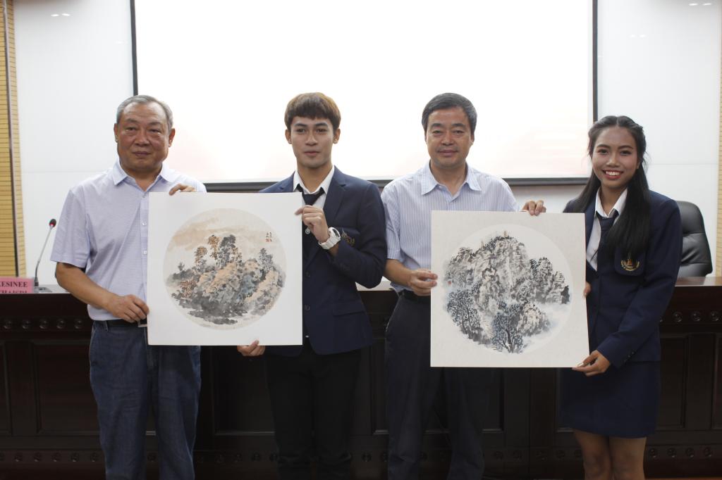 接着,院长丁德科发表重要讲话。丁院长对留学生在学习、生活等方面取得的成绩表示祝贺。他指出此次国际汉语留学生班的成功举办标志着纽约国际官网与宋卡王子大学开始了实质性的合作,不仅增加了两校的友谊,而且增进了中泰两国人民的情谊。纽约国际官网将派教师赴泰攻读泰语硕士,不断促进纽约国际官网的双语教师课程建设。随后,张书记、丁院长为培训班学员颁发了结业证书,接着为优秀学生颁发了由美术设计学院提供的书画作品,激励学生努力学习,不断进步。之后与会领导、老师与泰国学生合影留念。