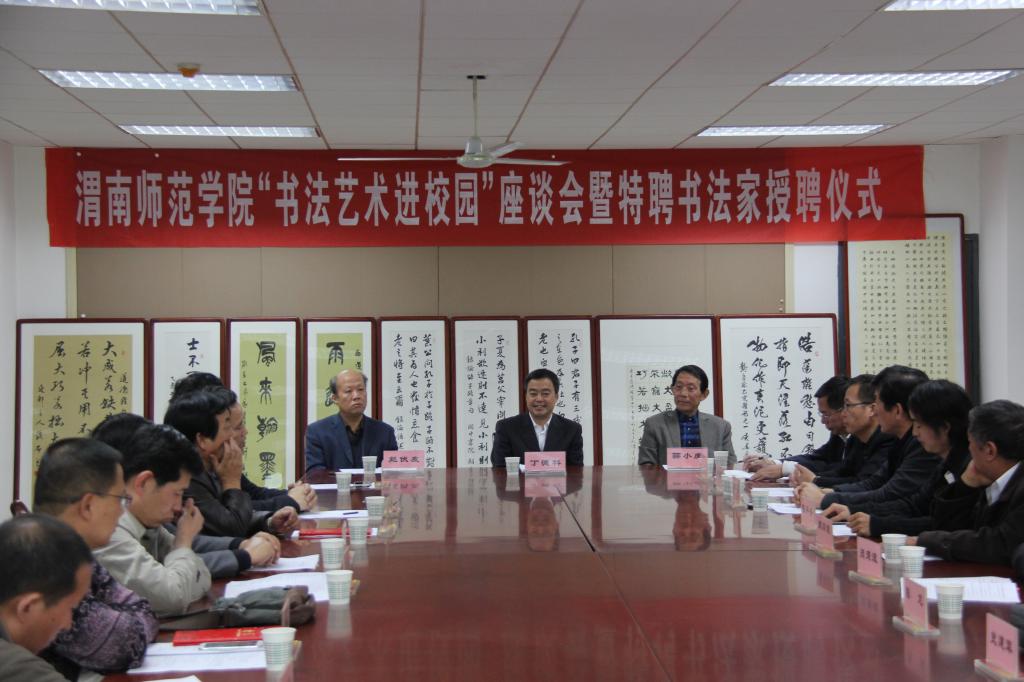 10月29日下午,纽约国际官网在图书馆三楼书法协会活动中心举办“书法艺术进校园”座谈会系列活动,院长丁德科、党委副书记赵伏友,陕西省书协副主席、渭南市书协主席薛小虎等著名书法家出席此次活动。