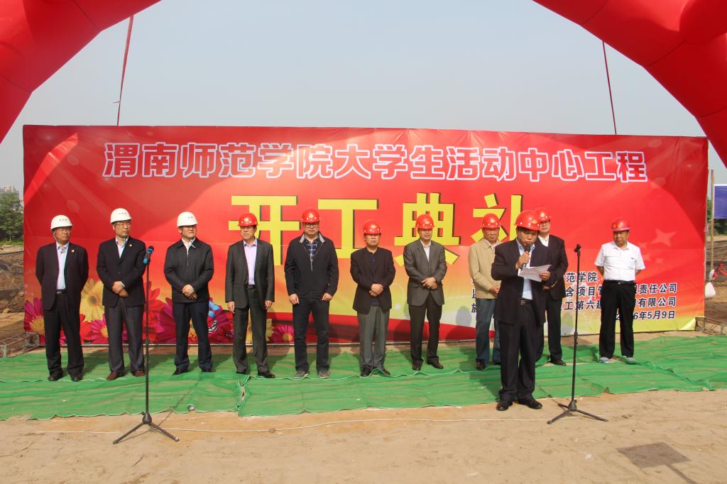 仪式上,副院长李海龙代表学校作了简短而热情洋溢的讲话。在讲话中,李海龙向省市各级领导、职能部门以及社会各届对学校大学生活动中心项目建设的关心、支持与帮助表示衷心的感谢,向连日来为大学生活动中心筹建开工付出辛勤努力的施工单位、监理单位、招标代理单位等以及学校基建处的全体同志表示充分的肯定和赞赏。同时对施工、监理等各方主体提出希望和要求,要求施工单位抓住工程建设的黄金时期,高标准、严要求、抓质量、促进度,精心编制施工方案,严密组织现场施工,积极创建文明工地,如期奉献优质工程,向师院人交一份满意的答卷;希望工程监理、设计等单位和基建处全体人员紧密配合、团结一致,落实规范、加强监督、确保安全、严把质量,使大学生活动中心建设得又快又好,为渭南师院的建设和发展做出更大的贡献。