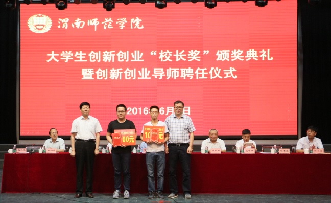 6月8日,2016年大学生创新创业”校长奖“颁奖典礼暨创新创业导师聘任仪式在陶然楼演艺厅举行。陕西宝塔山油漆股份有限公司董事长李松财,中国电信渭南分公司党委书记、总经理齐飞,中国移动渭南分公司副总经理张伟明等三位企业代表及学校党委书记张金安、校长丁德科、纪委书记任健、副校长程书强、党委委员杨小渭、校长助理韩小卫等领导出席了本次颁奖典礼暨聘任仪式。仪式由学校党委副书记赵伏友主持。