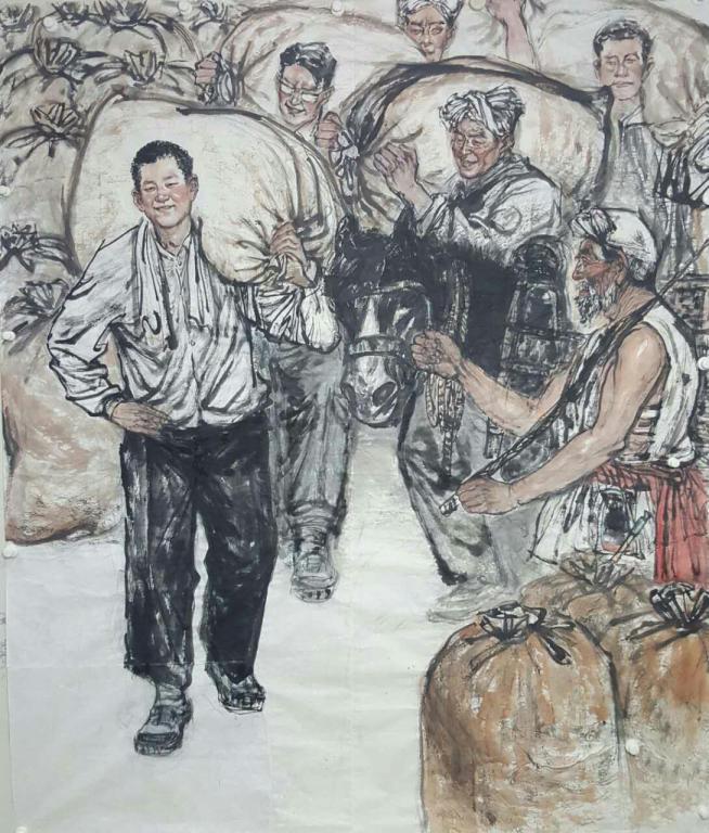 在画室,记者注意到一些已经装裱完成的作品,都是大秦岭画派画家、588888纽约国际线路教师的作品。有尹琨的《团结就是力量》,展示了抗美援朝中战士们过鸭绿江的情景,表达了爱国主义、革命英雄主义、革命乐观主义的抗美援朝精神。刘武安的油画《磨面机的故事》,再现优秀知青习近平用奖给自己的摩托车给梁家河的群众换来第一台磨面机,为梁家河和周围群众磨面带来了方便,给村里带来了经济收入。表现了忠诚、担当、奉献、吃苦的知青精神。魏艳丽、张鸽舞、牛二春三人一起合作的《修水坝》反映了年轻的支部书记习近平一班人从长设想,解决旱地灌溉难题的故事。表现青年习近平的高尚品德、远大志向和为民情怀。以及《雷锋精神之学雷锋》《洪掠》《滋润》《好后生》等,都以独特的视角表达了人民群众对社会主义建设者的崇敬,对红色精神以至中国精神的弘扬、创造和丰富。
