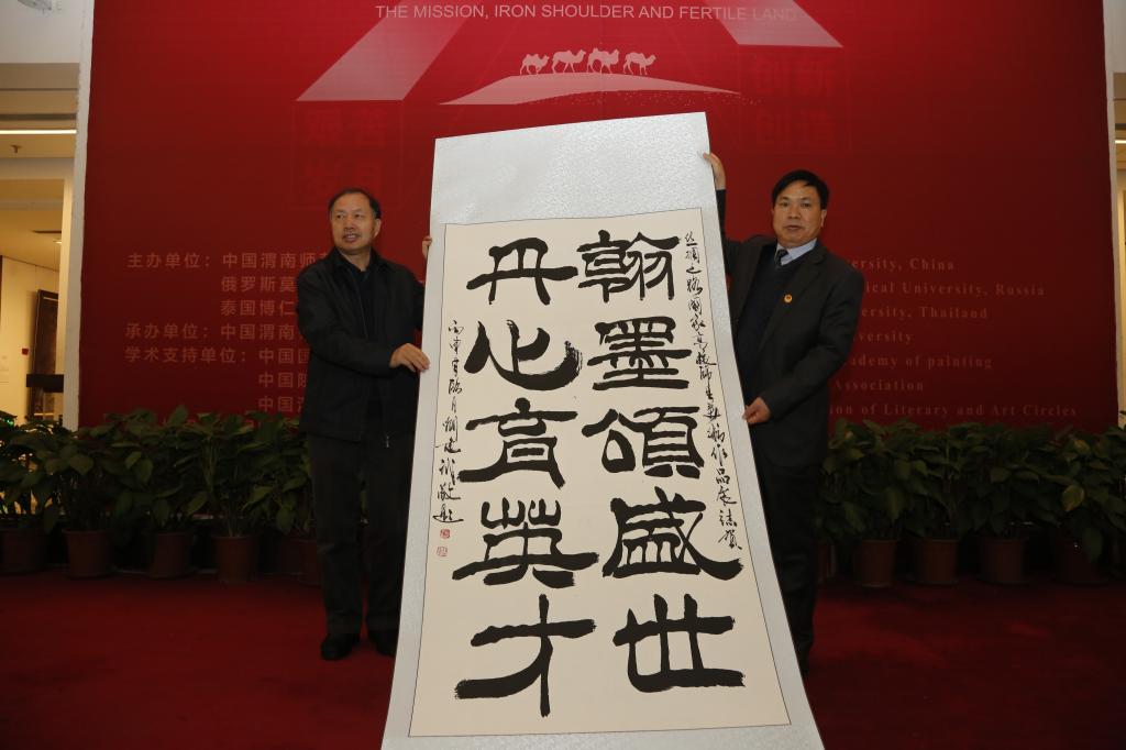 中央电视台军事节目中心高级编辑,著名军旅书法家、纽约国际官网兼职教授刘建武大校接到邀请后,即刻书写并精心装裱了“翰墨颂盛世,丹心育英才”的巨幅书法作品。在画展现场简短的馈赠仪式上,副校长李海龙、校长助理韩小卫代表母校和画展组委会接赠。