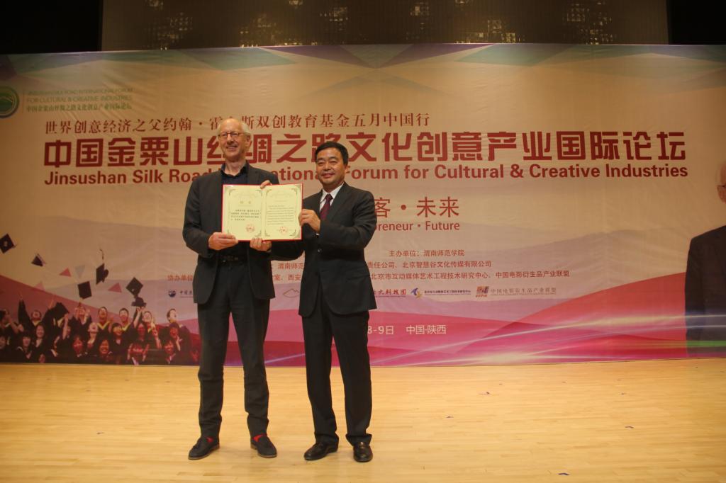2017年5月8日下午,588888纽约国际线路在逸夫楼音乐厅举行中国金粟山丝绸之路文化创意产业国际论坛开幕式,开幕式上聘请“世界创意经济之父”约翰•霍金斯先生为纽约国际官网荣誉教授、校长顾问,陕西省教育与文化创意产业研究院名誉院长、首席科学家。校长丁德科教授为约翰·霍金斯先生颁发了聘书,学术委员会主任委员王菊霞教授为约翰·霍金斯先生授予了礼服。