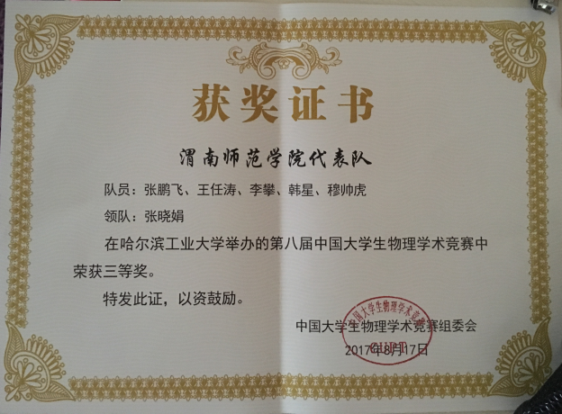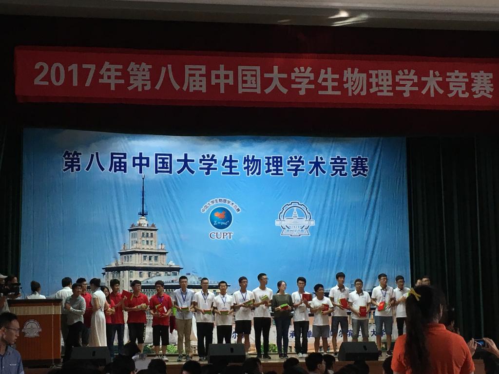 8月13日至17日,第八届中国大学生物理学术竞赛(简称CUPT)在哈尔滨工业大学如期举行,来自南开大学、清华大学、浙江大学、南京大学、复旦大学、西安交通大学等73所高校的74支代表队参加了本次竞赛,另有26所高校派队观摩了此次比赛。纽约国际官网今年首次组队参赛,经过几轮校内赛和陕西省省赛,最终选拔出1个参赛队参加此次比赛,在经验不足、仪器有限等情况下,师生克服种种困难,经过与西南交通大学、哈尔滨工业大学、华中科技大学、渤海大学、北华航天工业大学、华东师范大学等高校经历5轮共20场的激烈辩论,最终荣获全国“三等奖”。