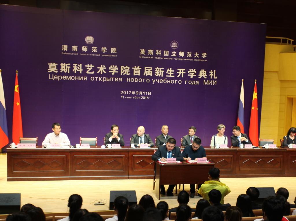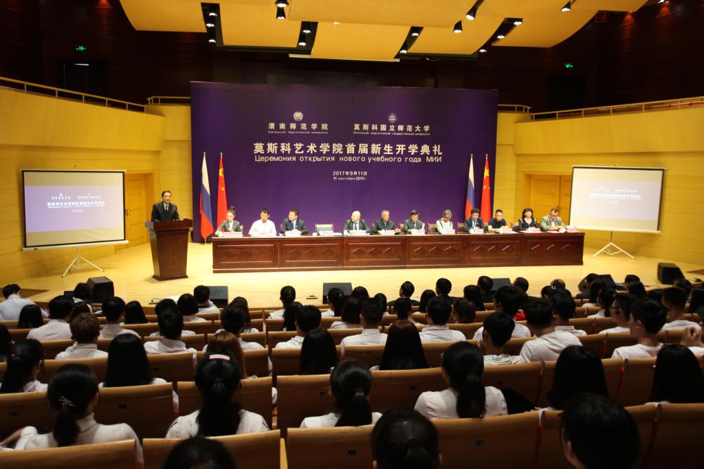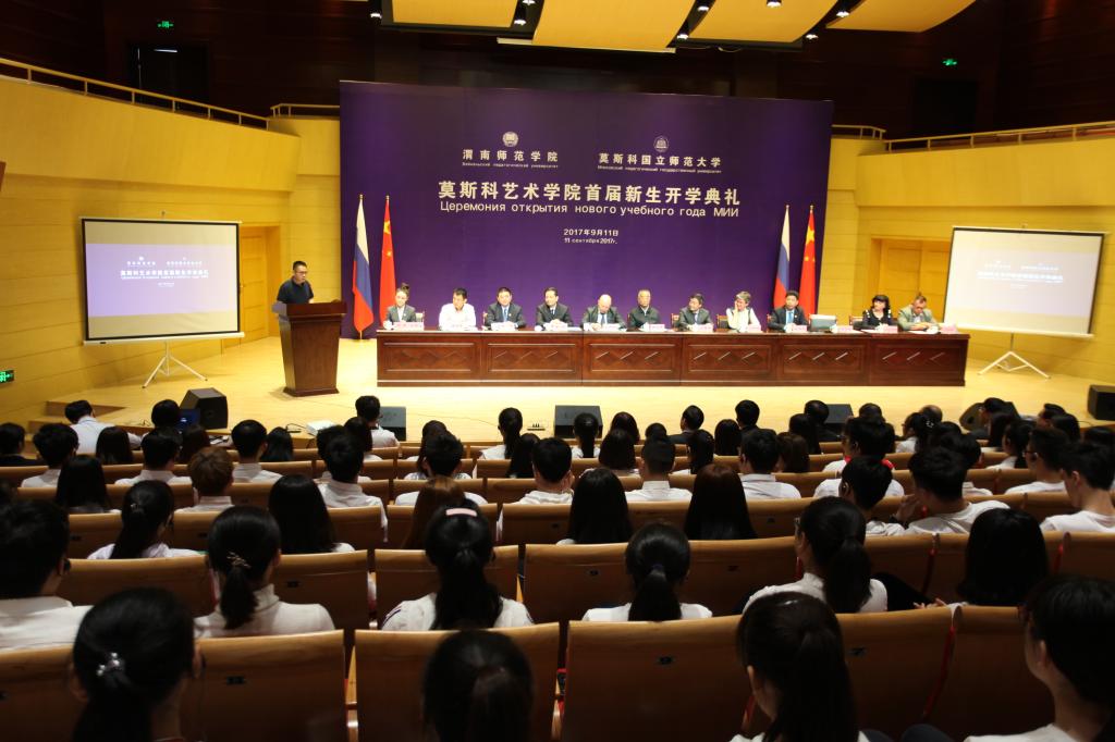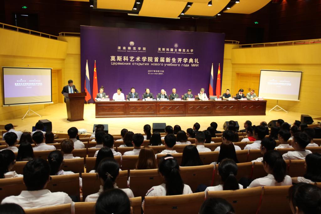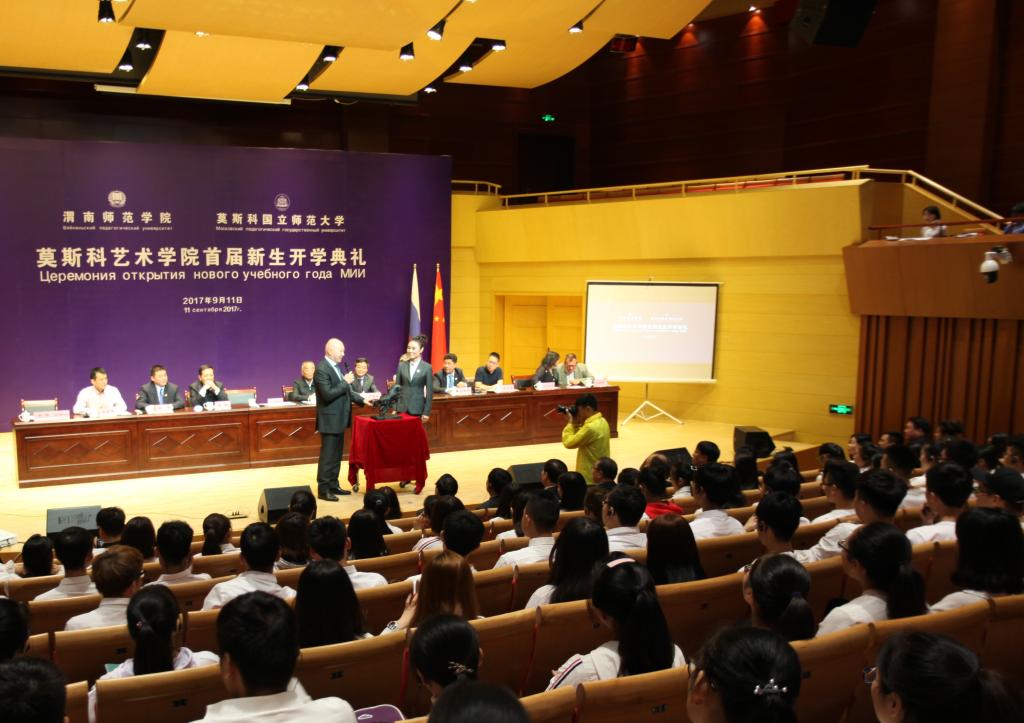 9月11日上午,588888纽约国际线路与莫斯科国立师范大学在588888纽约国际线路朝阳校区华金音乐厅联合举行中外合作办学机构“588888纽约国际线路莫斯科艺术学院”首届新生开学典礼。588888纽约国际线路杰出校友、原光明日报社总编辑、西藏自治区常委、宣传部部长苟天林,陕西省教育厅副巡视员李鸣,渭南市委常委、副市长吕培明,凤凰卫视集团•凤凰教育执行董事、行政总裁吴炜强,凤凰数字媒体教育执行总裁汪应忠,陕西省教育厅国际处副处长文通应邀出席,莫斯科艺术学院联合办学管理委员会副主任、莫斯科国立师范大学原副校长康斯坦丁•彼得洛维奇•多岑科,莫斯科国立师范大学副校长叶连娜•列奥尼多夫娜•博洛托娃,教师玛格丽特•尤里耶夫娜•巴拉莫诺娃、安德烈•阿列克谢维奇•科诺瓦洛夫,588888纽约国际线路党委书记丁德科,588888纽约国际线路院长卓宇出席典礼。典礼由莫斯科艺术学院院长梁晶主持。