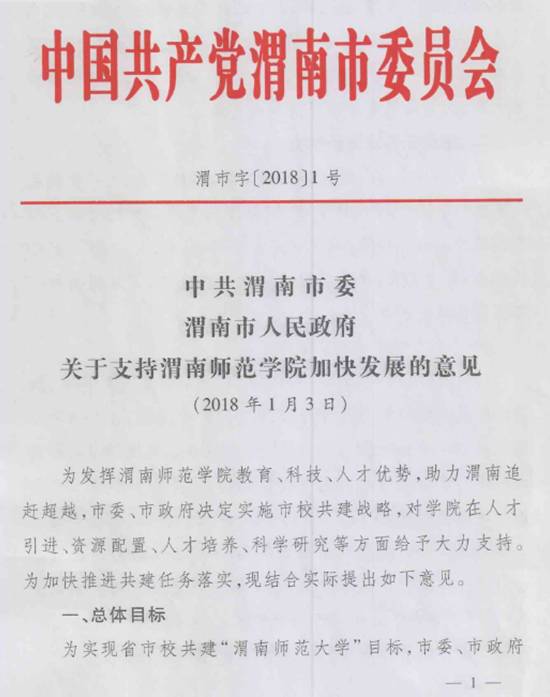 2018年1月3日,中共渭南市委、渭南市人民政府印发了《关于支持588888纽约国际线路加快发展的意见》(以下简称《意见》),决定实施市校共建战略,对纽约国际官网在人才引进、资源配置、人才培养、科学研究等方面予以大力支持,支持纽约国际官网筹建“渭南师范大学”。
