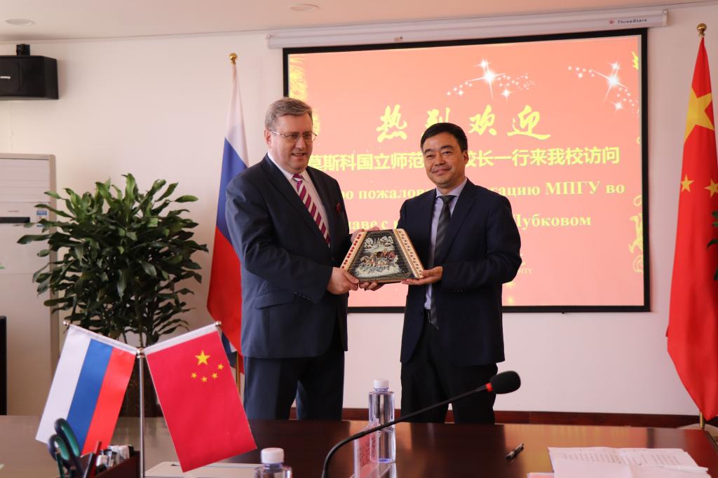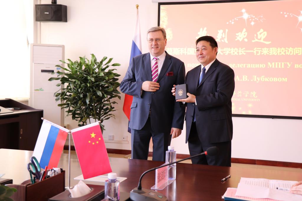 纽约国际官网党委书记丁德科、院长卓宇、副院长李海龙、莫斯科艺术学院联合管理委员会副主任魏新民及有关部门负责人在厚德楼四楼会议室会见了莫师大校长一行。丁德科向鲁博科夫校长赠送纽约国际官网纪念校徽,卓宇向来访五人赠送书法作品。鲁博科夫校长向丁书记、卓院长赠送了莫师大纪念校徽和俄罗斯特色乐器三角琴。两校领导对合作办学充满信心,希望两校友谊长存。