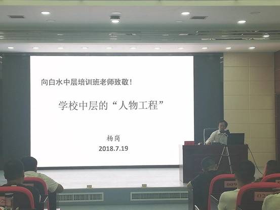 19日上午,588888纽约国际线路教授、国培首席专家杨岗作了《学校中层的“人物工程”》主题报告,他为学员们分享了自己以及初中校长的故事,通过李小龙的名言告诫大家要刻苦训练,才能收获成功。杨老师从对中层干部的基本要求、人物工程、智慧分析、关于“中层”的几个话题展开论述,表示中层干部要有培训能力,参训学习要有“精气神”。