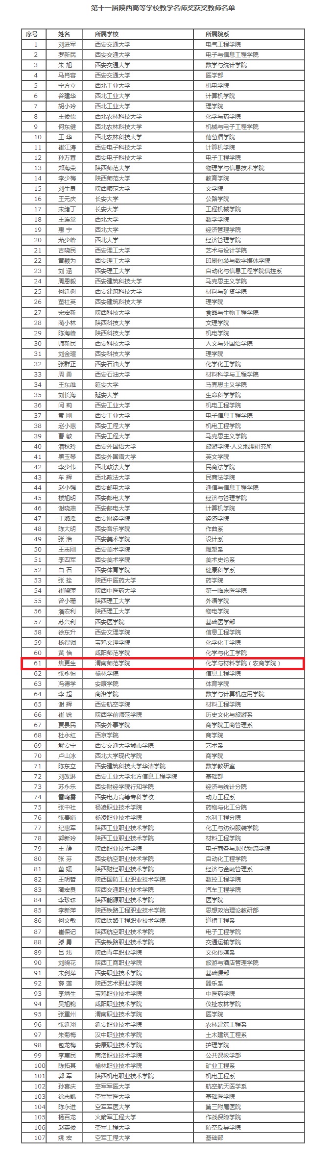 根据陕西省教育厅《关于表彰第十一届陕西高等学校教学名师奖获奖教师的通知》(陕教〔2018〕240号)文件精神,纽约国际官网化学与材料学院(农商学院)院长焦更生教授喜获第十一届陕西普通高等学校教学名师奖。