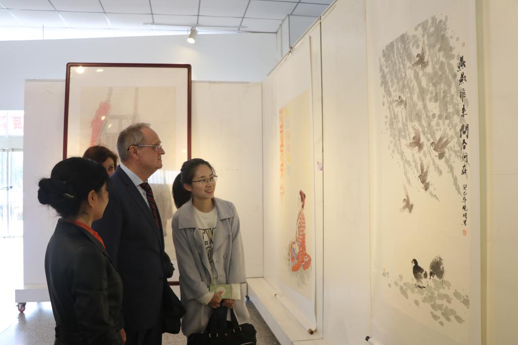 随后,维克多·德罗诺夫校长一行在副校长李海龙、国际合作与交流处处长杜百顺、莫斯科艺术学院书记席景奇等人的陪同下看望了莫斯科艺术学院2017、2018级学生。并参观了以“融汇·探究”为主题的莫斯科艺术学院美术学H专业师生作品展。