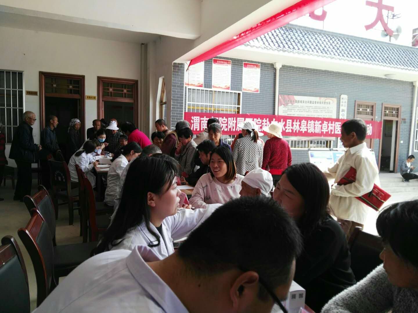 4月24日上午,附属医院扶贫义诊医疗队来到白水县林皋镇新卓村村委会办公室开展扶贫义诊活动。义诊医疗队携带了B超、心电、血糖、血压等医疗设备和药品,为村民进行内科、外科、中医科、康复科、皮肤科、口腔科的诊疗。义诊活动期间,医务人员细致地询问就诊村民病史,仔细查体、询问患者的生活习惯,耐心细致解答患者问题,对患者进行初步筛查,诊断病情,依据病症免费发放药品,详细交代药物的服用方法及注意事项,为村民提供健康咨询和用药指导。义诊工作有条不紊的进行,诊病、检查、取药,每个项目都排了许多人,当村民拿着诊断和药品离开的时候,脸上都洋溢着满足和感激。义诊活动一直持续到中午1点多,前来看病的村民才全部离去。