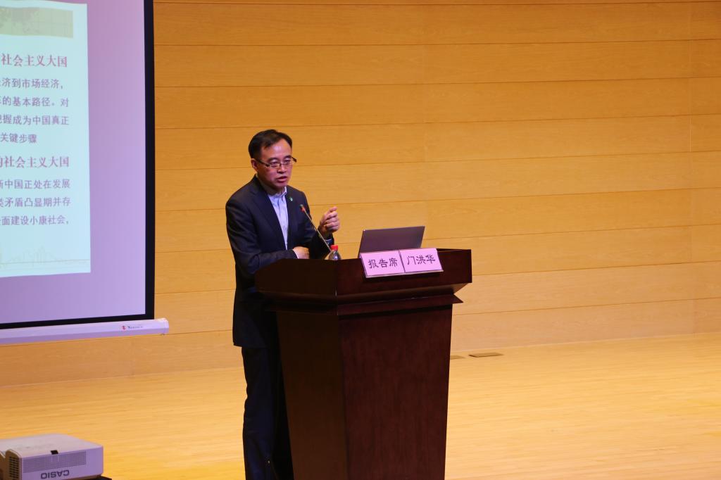 门教授主要从走进新时代的中国与世界、中国国家定位与战略取向、中国外交思想的理论创新、新型国际关系的战略路径、全球治理与中国地区战略、东亚合作与中国战略重心等六个方面,就新时代的中国外交主题与大家作了深入、系统的交流探讨。他从大的历史背景、国际关系发展不同阶段进行纵向分析,从政治、经济、人口、文化、战略等方面进行横向比较,其中重点对中美日三国发展实力的消长进行对比,使师生们清楚了解了国际国内发展形势,进一步感受到了中国的政治、经济、人口、文化等方面的优势,增强了“四个自信”。同时也使师生们清醒的看到了我国各方面发展的劣势、困境,廓清了很多人对国内发展、国际形势的一些不正确、不清醒的认识。