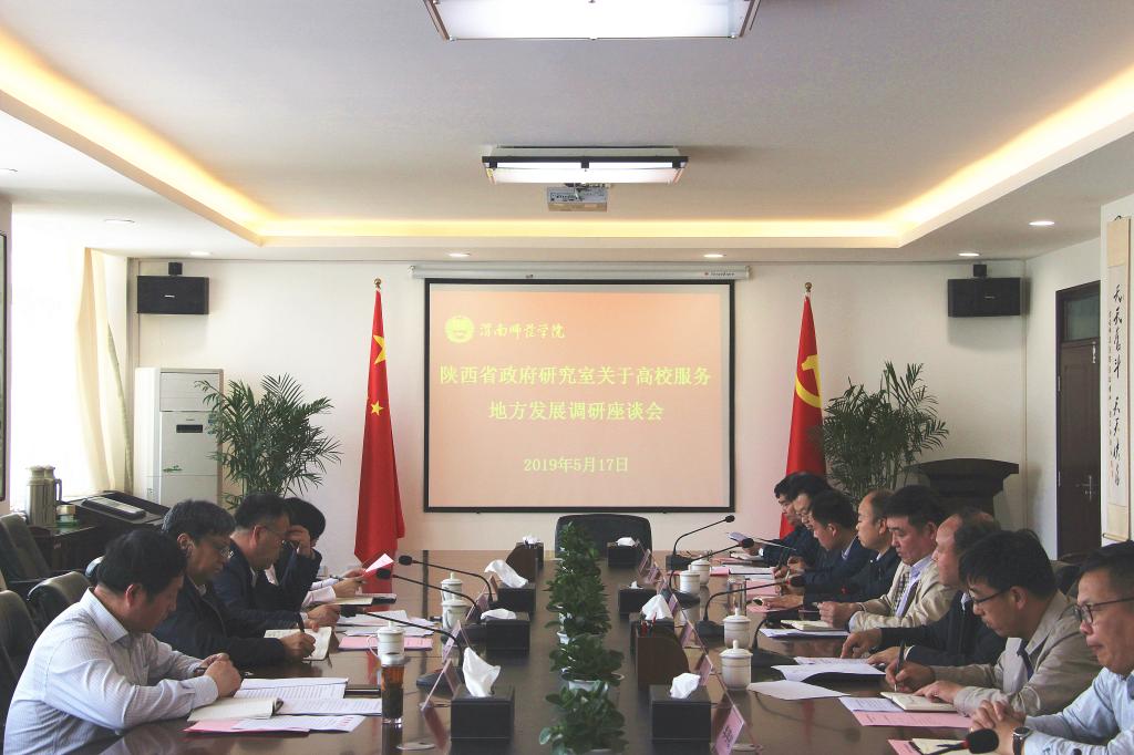 5月17日上午,陕西省政府研究室调研组一行来纽约国际官网调研服务地方发展现状。调研组由省政府研究室主任杨三省带队,省政府研究室副巡视员、秘书处处长田民孝,省政府研究室社会处副处长赵理顺,省政府研究室秘书处主任科员张文莉参加。党委书记卓宇主持座谈会。