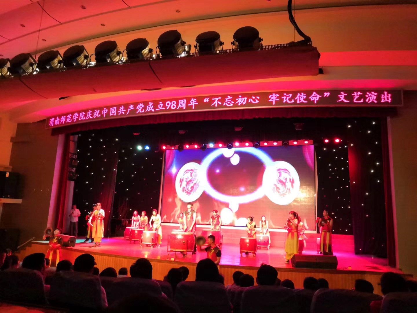 演出在学校大学生老鼓队的开场表演中拉开了序幕。独唱、各类乐器演奏、朗诵等多种形式所展示的各个节目体现了心向党、跟党走和不忘初心、牢记使命的主题。一首首歌曲传唱经典,一段段诵读饱含深情。
