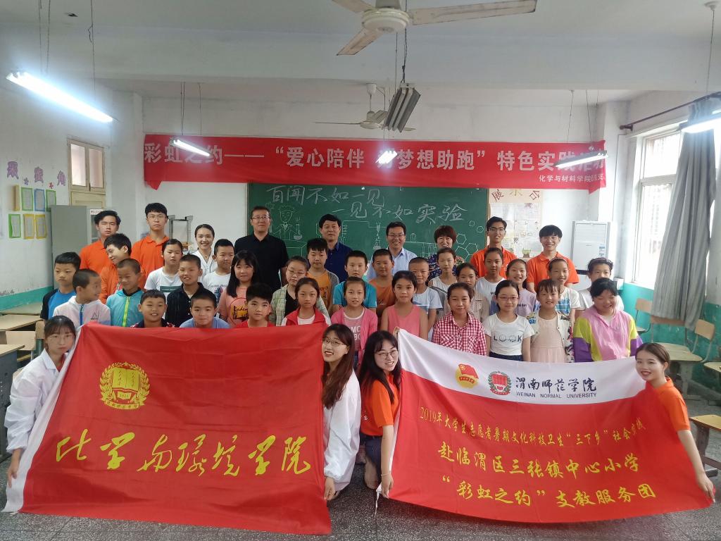 在三张镇中心小学,化学与材料学院团总支书记张小苗、团队负责人苟婕同学分别介绍了“彩虹之约”支教团队开展“爱心陪伴为梦想助跑”特色实践活动的基本情况及课程安排。支教团队连续六年开展暑期三下乡特色支教活动,今年他们将中国传统文化和爱国主义教育结合起来,设计参观渭华起义纪念馆、爱国诗歌朗诵、红歌学唱、书法课、手工制作国旗等特色活动,为留守儿童送去关爱的同时,在他们心中厚植爱国情怀。任书记一行还进入教室观摩了生动的趣味化学课。