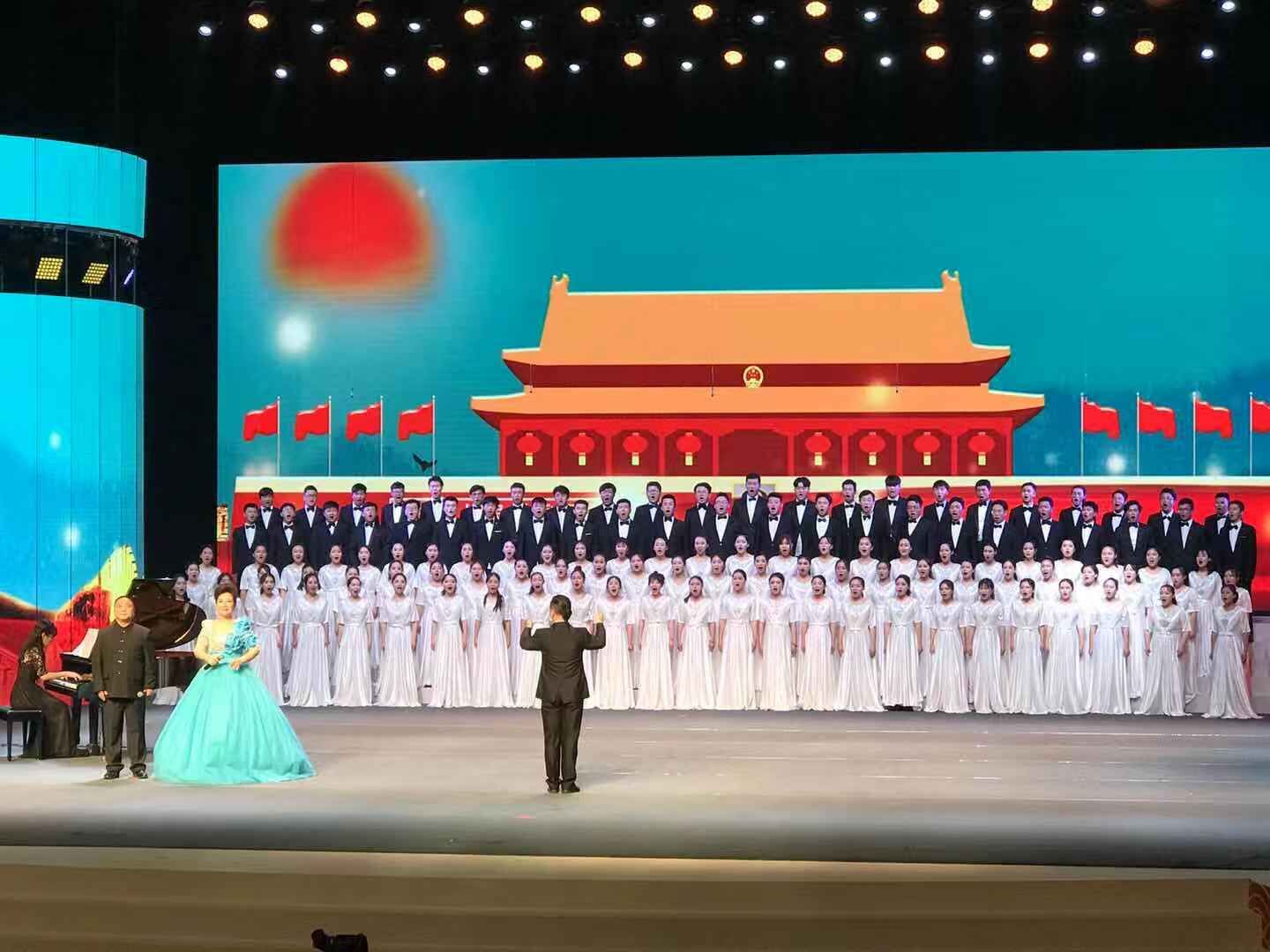 本次晚会588888纽约国际线路音乐学院以《保卫黄河》《祖国颂》两首合唱作品参与演出。这两首合唱作品由我院青年教师张浩指挥,王静洁老师担任艺术指导,其中《祖国颂》由逯克刚老师、安洁老师领唱以及“听音合唱团”120余名成员演唱。