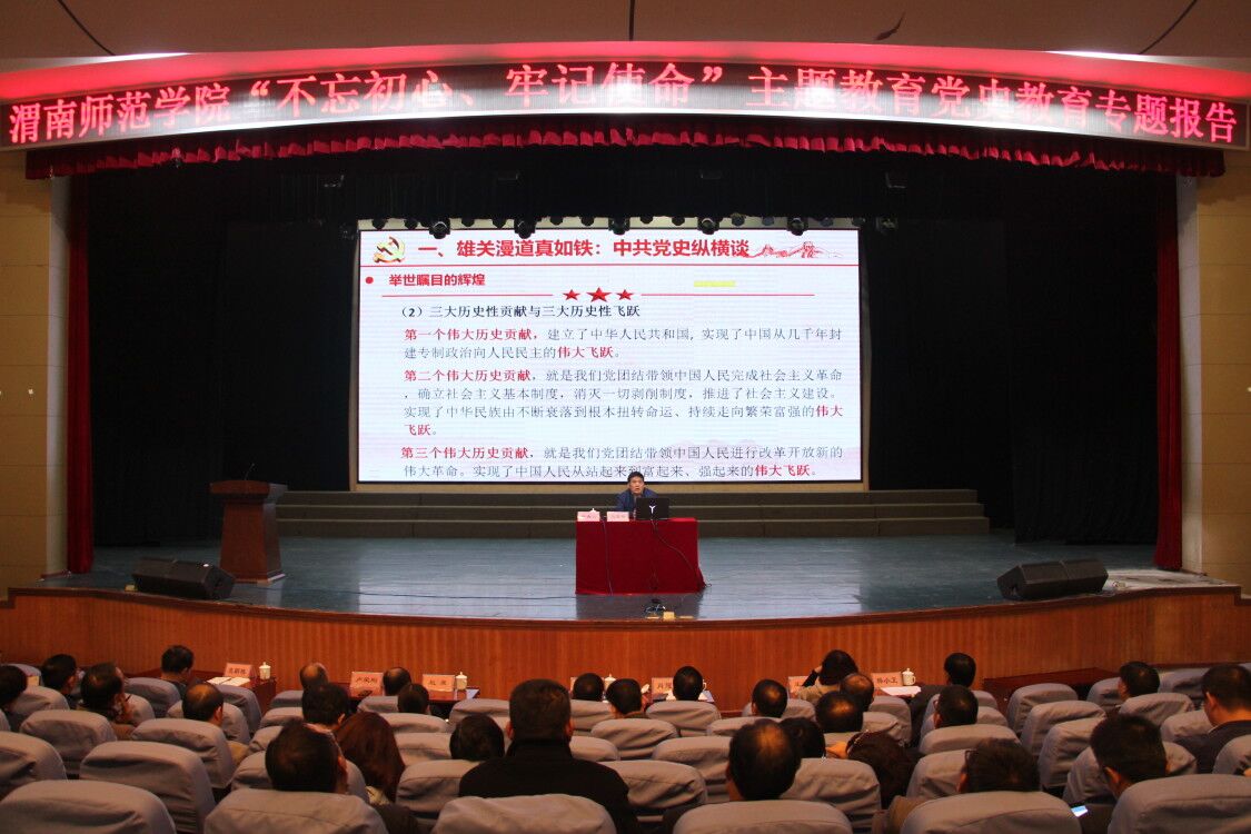 报告会从雄关漫道真如铁,中共党史纵横谈、以史为鉴,把握“不忘初心、牢记使命”主题教育的时代要求、着眼未来,永立潮头不辱使命三个方面展开,回顾了中国共产党的艰难历程和取得的辉煌成就。