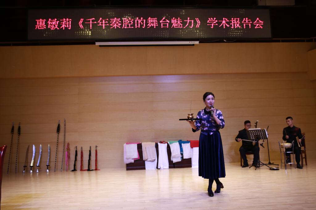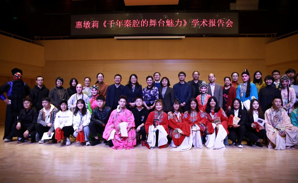 报告会上,惠敏莉以一段优美的秦腔表演精彩开讲。她从秦腔的起源谈起,配以躬身范唱经典选段、队员上台展示四功五法、学生置换戏装体验秦腔魅力等形式,为现场500多名师生讲解了秦腔的编演种类、声腔特点、主奏乐器和唱词、板式等内容,现场掌声阵阵、气氛活跃。她从创社者的民族担当讲到继承者的创新发展,观众的耳眼神经被百年易俗社的发展历程所吸引。惠敏莉以此为源,结合自身学戏经历,对青年学子提出了殷殷期望。她希望在座的传媒学子能热爱戏剧艺术,关注传统文化,夯实知识,踏实努力,为中华民族扛负起文化传播的神圣使命。