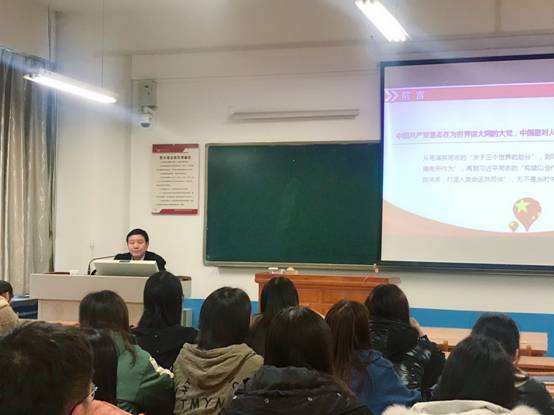 11月28日下午,纪委书记肖耀刚以《世界秩序与世界贸易》为题,在博识楼1216教室为人文学院汉语言文学专业181班全体同学作形势与政策专题讲座,人文学院院长曹强,副院长赵前明,办公室主任张晶参加了讲座,讲座由人文学院党总支副书记李三岗主持。