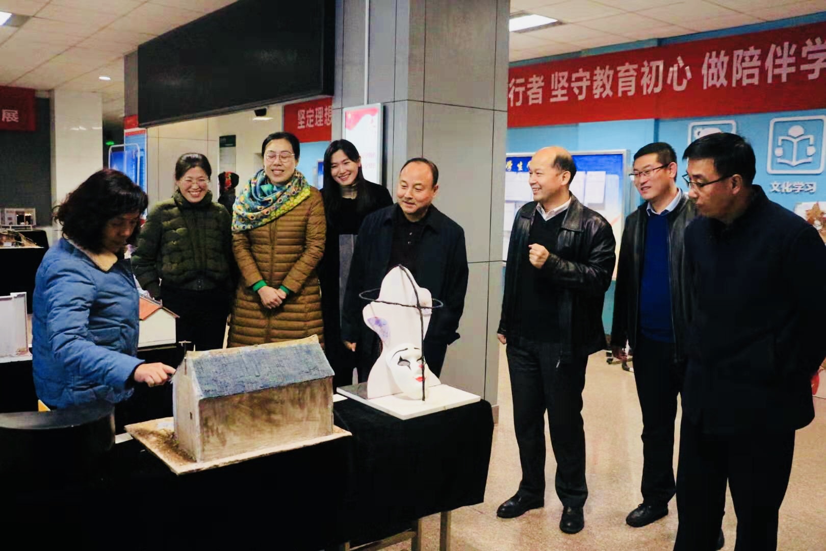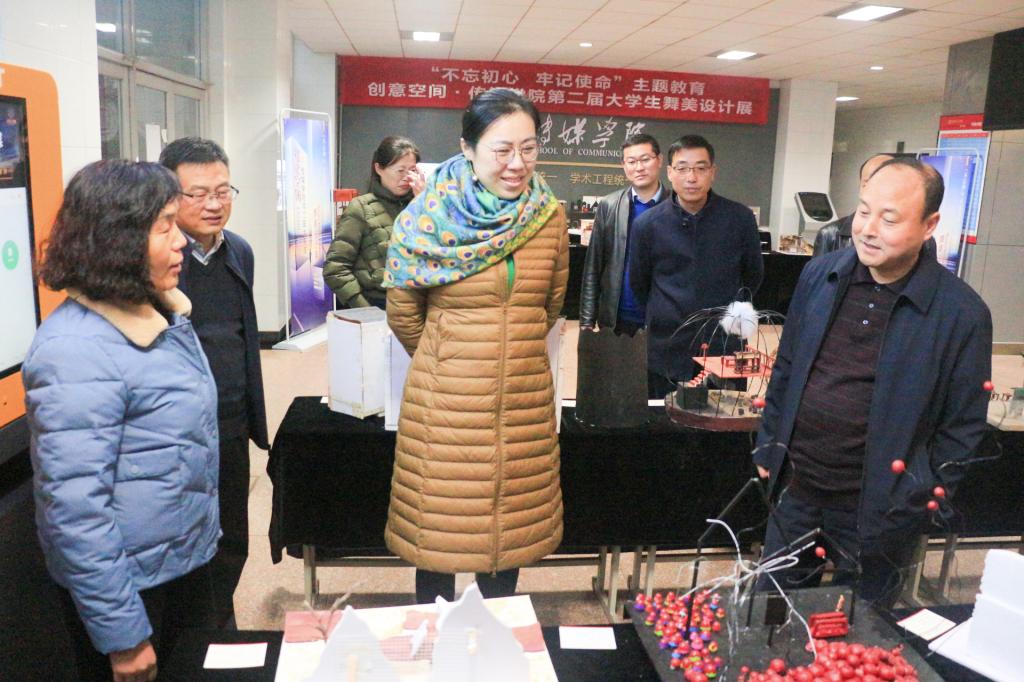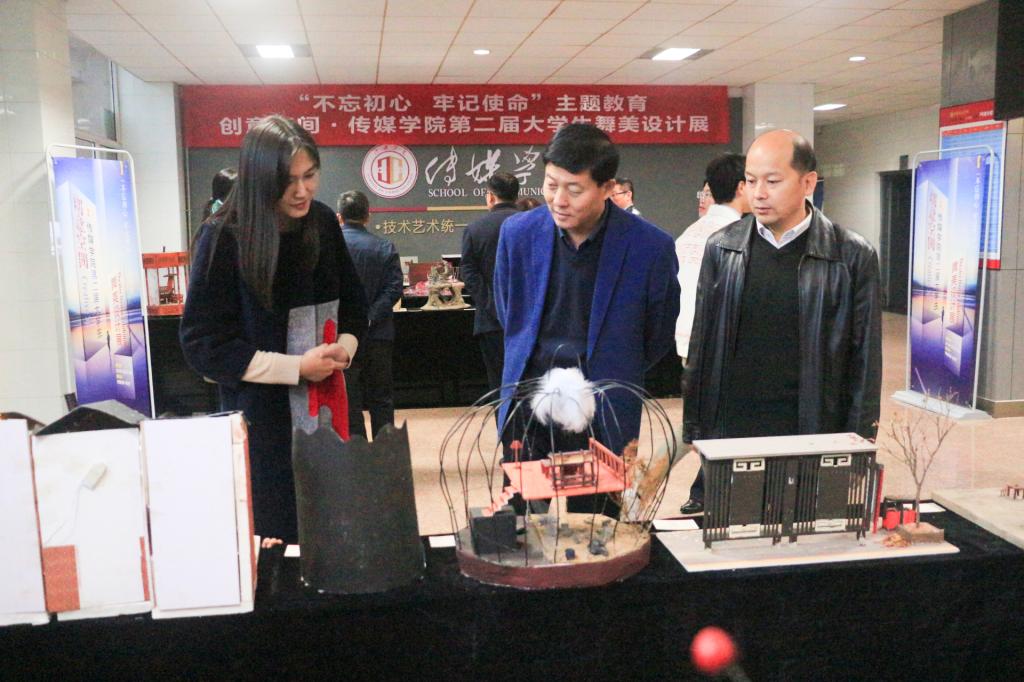 为切实将“不忘初心、牢记使命”主题教育调研成果运用转化为实际工作成效,扎实推进主题教育走深走细走实,传媒学院结合自身专业实际,于11月27日至30日在积学楼一楼展厅举办“不忘初心、牢记使命”主题教育——创意空间•传媒学院第二届大学生舞美设计展。11月27日下午,校长赵曼,党委副书记任健,副校长王菊霞,韩小卫一行参观展览。