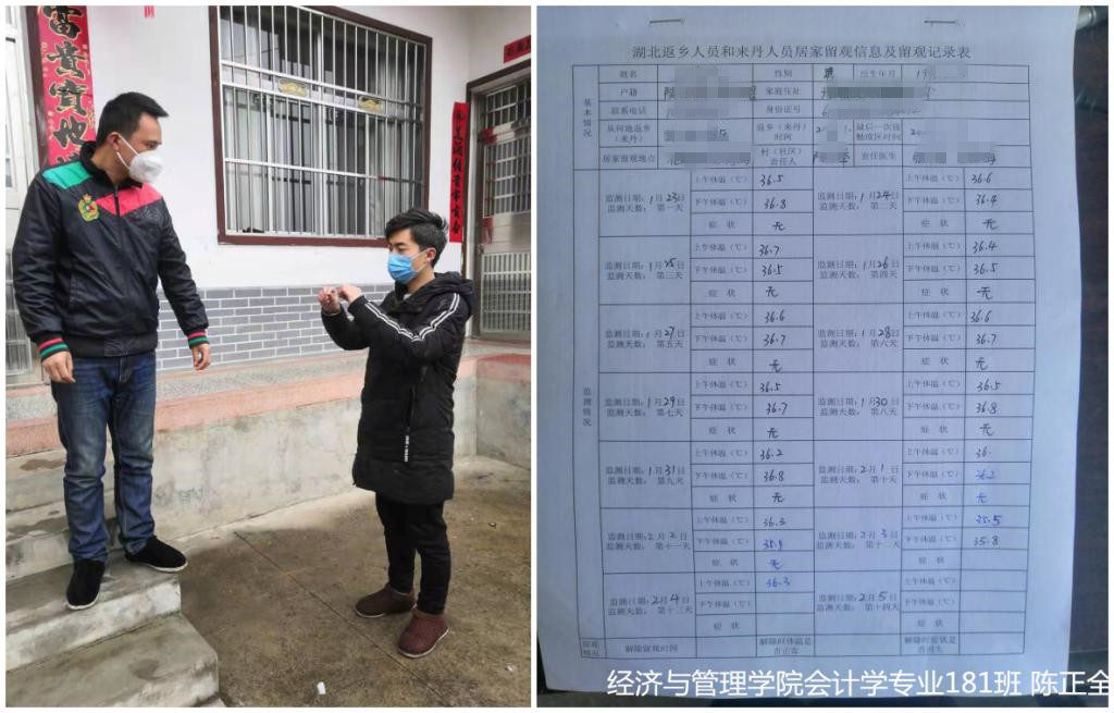 陈正全,经济与管理学院会计学专业181班学生,一名普通共青团员。疫情发生时,他也在老家商洛市丹凤县铁峪铺镇花魁村。面对新型冠状病毒感染的肺炎疫情,他响应学校倡议和贯彻地方政府有关防控新型冠状病毒感染肺炎的文件精神,积极参与花魁村卫生室防控监测点的工作。从1月22日起,他不怕困难、不畏疫情、科学防疫,协助村医主动承担为7名从外地返乡的人员做体温监测,询问被检测人的各种身体状况,并坚持做好记录。