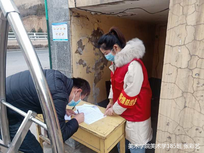 张彩艺,美术学院美术学185班学生,当得知社区疫情防控缺人手时,她勇敢地站了出来,以一名大学生志愿者身份报名参加桃杏村村委会建立的桃杏小区防控志愿活动。协助小区物业工作人员对出入人员及车辆认真登记排查。业余时间还主动宣传防疫知识,让小区居民了解防疫的重要性,在祖国和家乡需要的时候尽己所能,贡献力量。