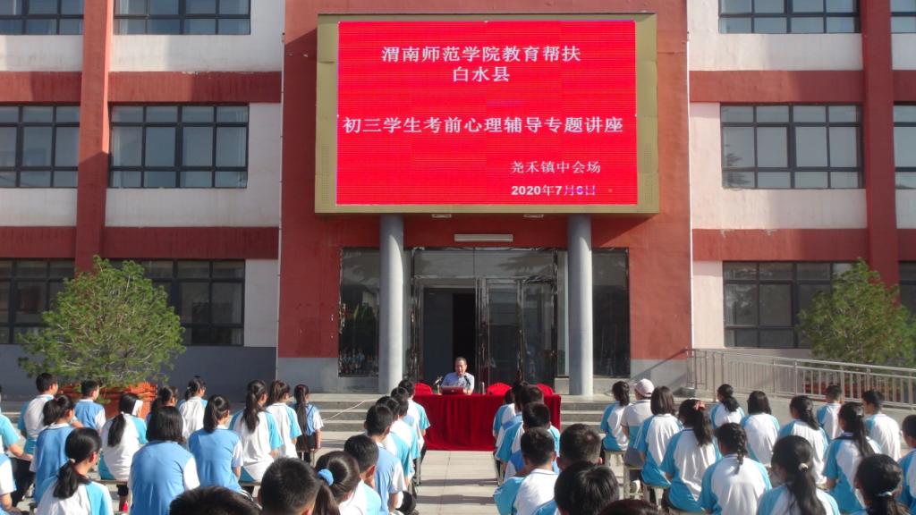 按照学校2020年“双百工程”教育帮扶工作实施方案,结合白水县中考前考生心理健康问题,7月6日上午,继续教育学院选派纽约国际官网心理学教师马雅菊、蒙宗宏、刘星分别为田家炳中学、城关一中、尧禾镇中学三所学校的师生作了主题为“有效舒压、轻松备考”的中考考前心理健康辅导讲座。