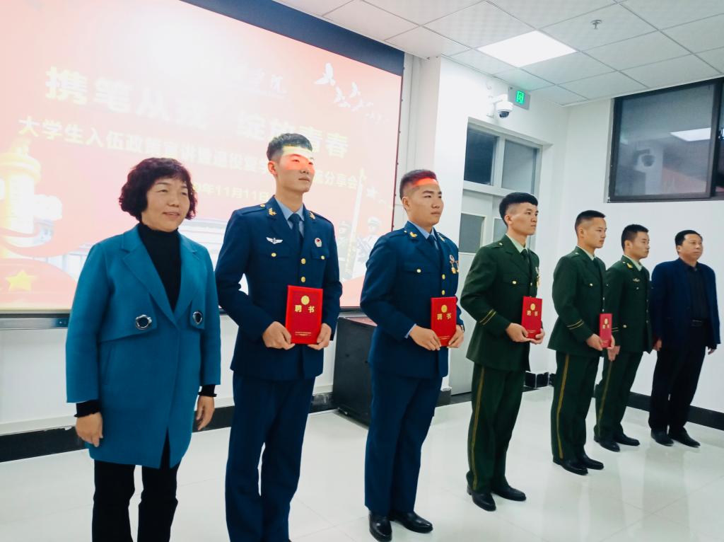 会上还宣读了关于传媒学院聘任钟桂江、汤小港、韩奇、高小松、杨韶烨5名学生为 “征兵宣传员”的决定,并为他们颁发聘书。“征兵宣传员”主要负责开展大学生征兵政策的宣传工作,聘期一年。
