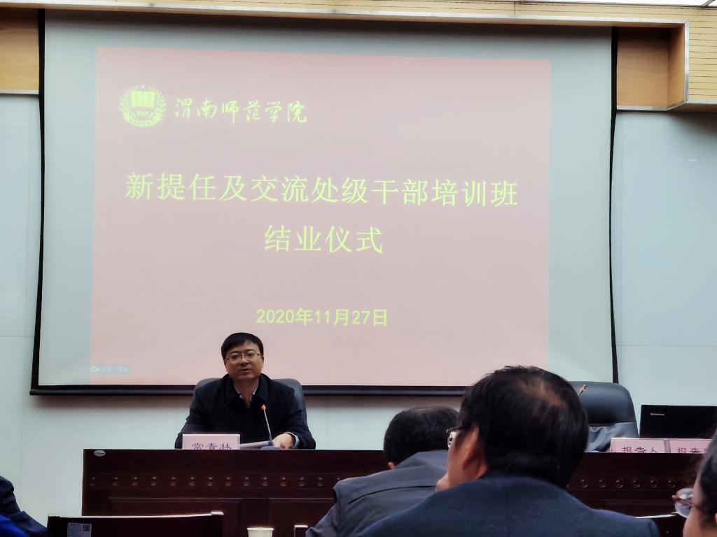 11月27日上午,党委委员、副校长常青林出席培训班结业式并讲话。常青林简要回顾了培训班的开展情况,充分肯定了培训班取得的成效,他认为这次学习培训组织有序,培训形式灵活,效果明显,全体学员思想重视、态度认真,学风端正。他就加强学习,进一步做好学校的各项工作对参训学员提出了两点希望。一是要提升思想境界,培养五种意识品质:大局意识和全局观念,公心品质、坚持公道正派,发扬民主、搞好团结,廉洁勤政意识、勇于担当作为,增强学习意识、树牢终身学习理念。二是要加强学习锻炼,提高七种能力素质:政治能力、调查研究能力、科学决策能力、改革攻坚能力、应急处突能力、群众工作能力和抓落实能力。并勉励大家真抓实干、锐意进取,齐心协力为申硕升大和学校发展做出更大的贡献。