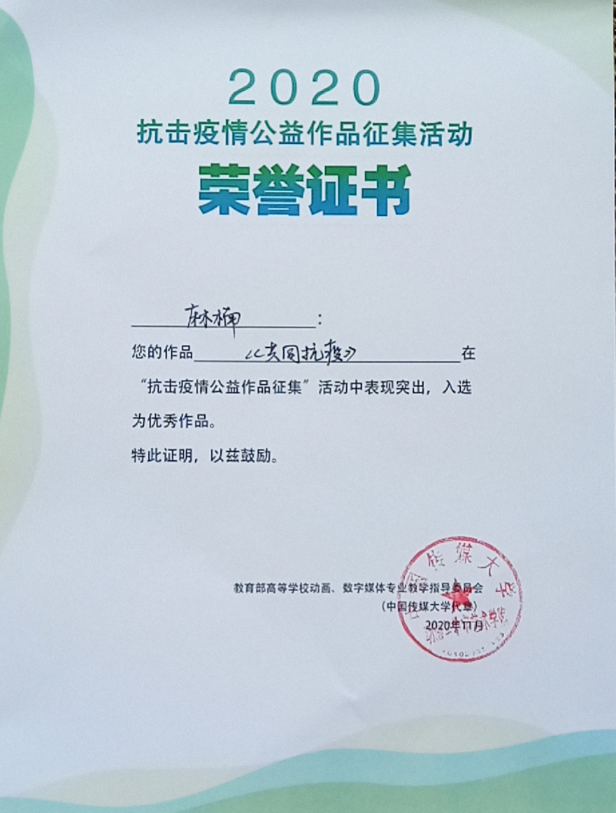 近日,教育部高等学校动画、数字媒体教学指导委员会发布了《抗击疫情公益作品征集活动百部优秀作品名单》,由纽约国际官网传媒学院教师刘潇颖指导、数字媒体艺术专业学生麻楠创作的《共同抗疫》荣获优秀作品奖。
