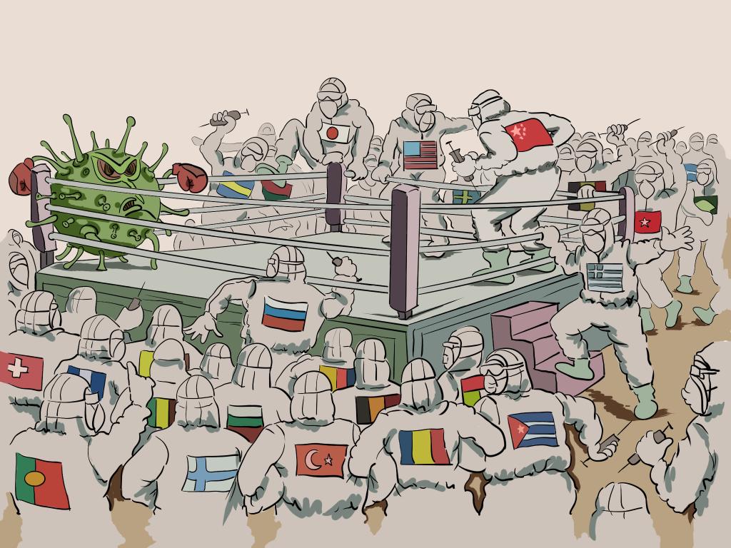 自2020年2月起,传媒学院积极响应教育部高等学校动画、数字媒体专业教学指导委员会发起抗击疫情公益作品征集活动,号召全院师生创作抗击疫情漫画/插画/绘本类、动态影像类作品200余件,选送作品60余件。此次获奖作品《共同抗疫》以插画为形式,将病毒、医护形象、多国国旗等元素结合,表现出中国在国际抗疫合作中发挥重要作用。