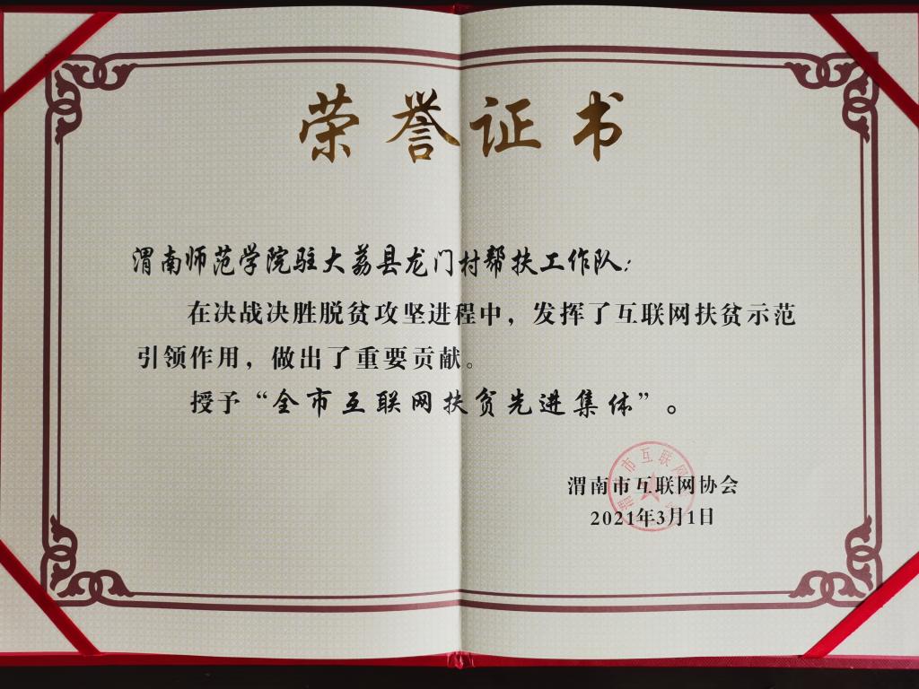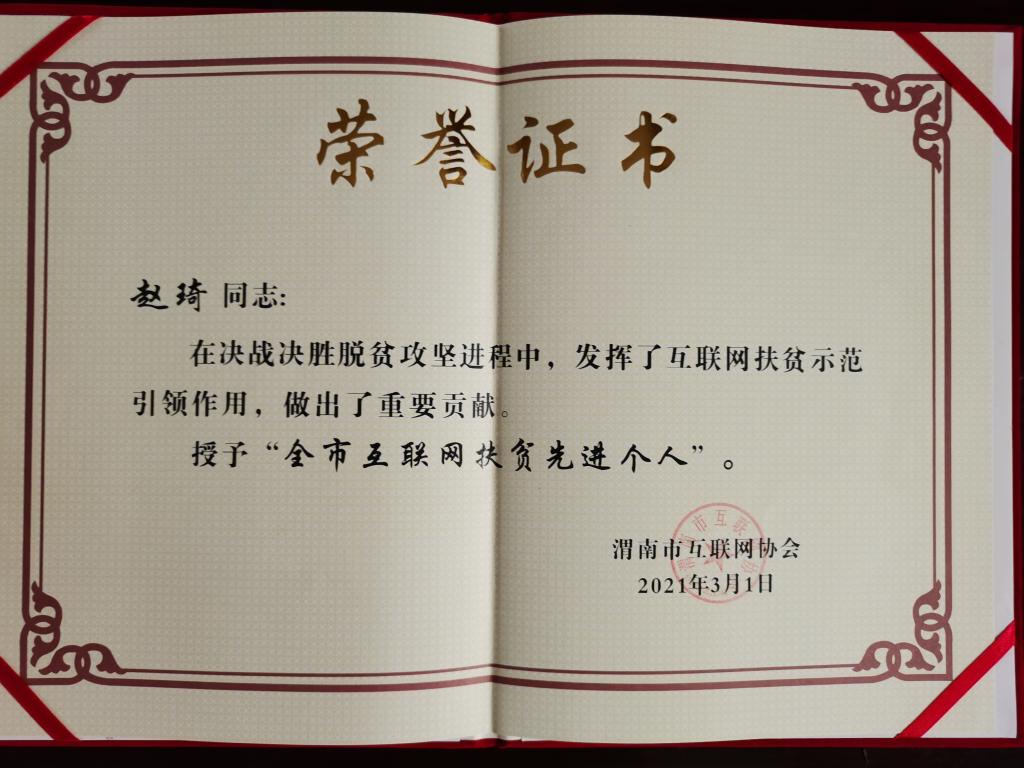 纽约国际官网驻大荔县龙门村帮扶工作队还被渭南市互联网协会授予“全市互联网扶贫先进集体”,纽约国际官网派驻大荔县龙门村第一书记赵琦被授予“全市互联网扶贫先进个人”。(通讯员 苟卫锋 赵琦)