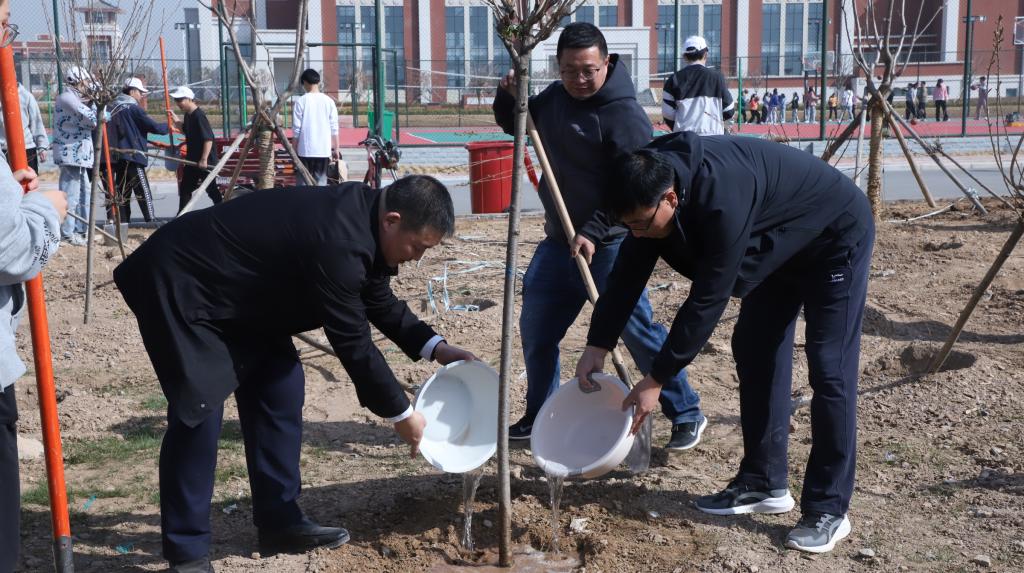 仪式上,学校学生会富平校区执行主席朱青青同学宣读了倡议书,后勤服务中心园艺师讲解了植树要领。随后,学校领导、师生代表分组行动、配合有序,师生“同栽爱心树、共植希望根”。植树现场劳动热情高、氛围浓,抬树、挑坑、扶苗、提苗、培土、踩实、浇水有条不紊。一个半小时时间,共栽植李桃、玉兰、海棠、北美海棠、垂丝海棠、樱花共计一千一百余株。