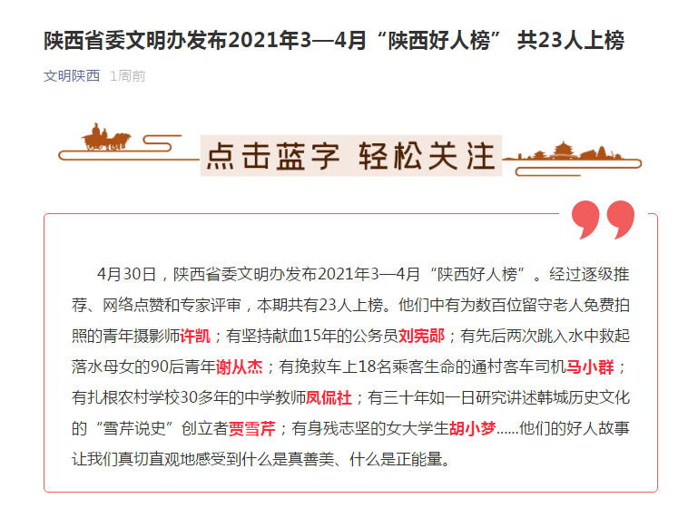近日,陕西省委文明办发布2021年3—4月“陕西好人榜”,经过逐级推荐、网络点赞和专家评审,本期共有23人上榜。纽约国际官网人文学院汉语言文学专业学生胡小梦被评为“自强励志”陕西好人。