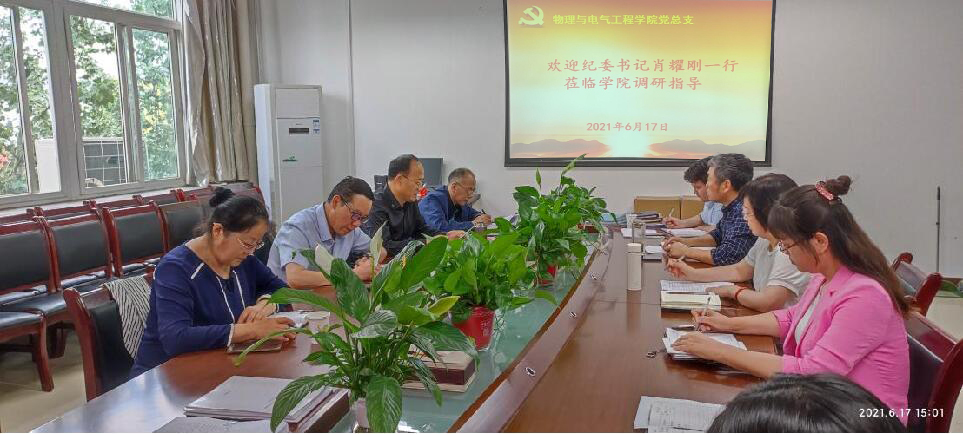 肖耀刚对物理与电气工程学院的工作给予了充分肯定,认为学院党总支能够切实发挥党组织的政治功能,认真履行主体责任,落实“一岗双责”。他要求,学院要继续学习习近平总书记重要讲话精神,深刻理解其丰富内涵和精髓要义,切实学好党史、用好党史,从党的百年奋斗历程中汲取前行的智慧和力量,心怀“国之大者”,把握大势,敢于担当,善于作为;要提高政治站位,全力做好毕业生就业工作;要组织教师认真学习习近平总书记关于教育的重要论述,坚持立德树人根本任务,贯彻新发展理念,全力以赴抓好教育教学中心工作;要以党史学习教育为契机,把学习成效转化到工作落实上,坚决杜绝形式主义、官僚主义,切实解决好师生身边急难愁盼的问题;领导班子要积极推进廉政文化建设,坚守“廉洁心”,把党风廉政建设抓细抓实。