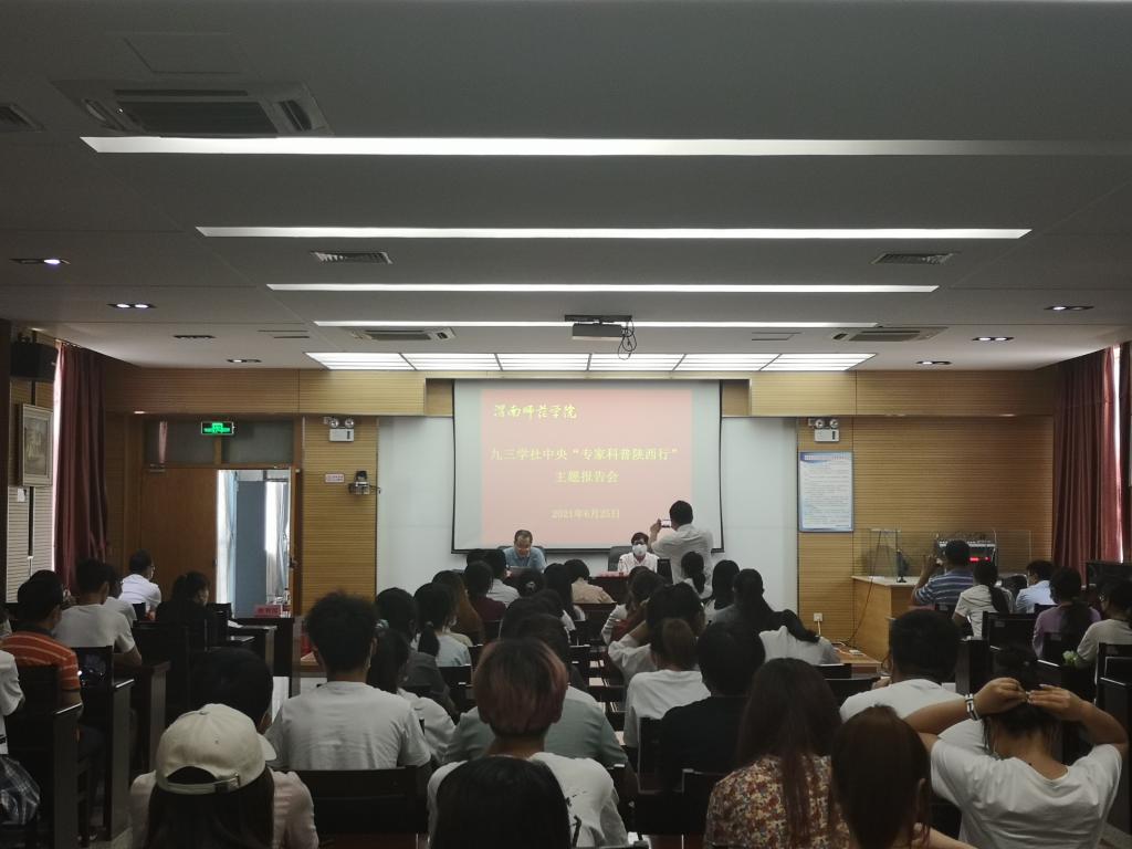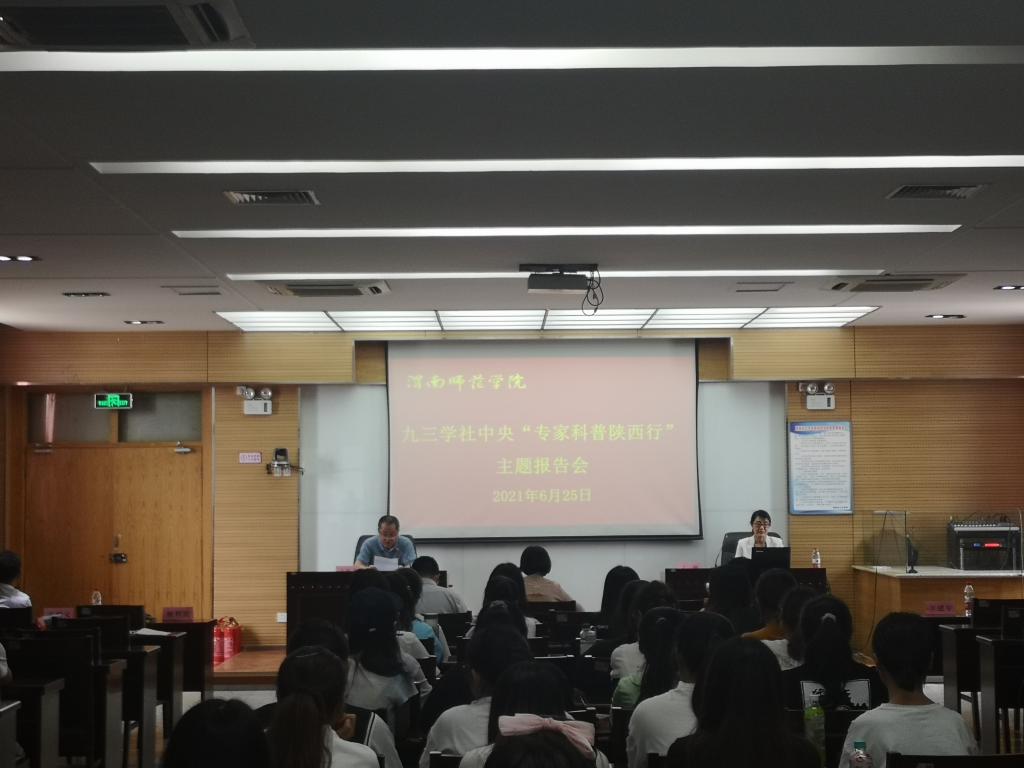 九三学社陕西省委社会服务部部长张雅宁、副部长丁鹏飞,九三学社渭南市委会专职副主委王建军,九三学社渭南市委会社会服务委员会主委陈锋,九三学社588888纽约国际线路支社主委乔明文出席报告会。九三学社渭南市委会成员代表,纽约国际官网统战部全体人员、九三学社588888纽约国际线路支社代表,以及环境与生命科学学院、外国语学院的师生代表等200余人聆听报告。(通讯员 宋威 审核人 杨利民)
