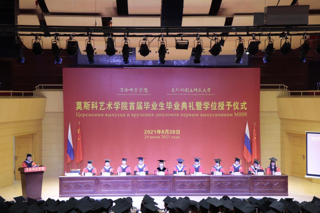毕业典礼在庄严的国歌声中拉开序幕。俄罗斯莫斯科国立师范大学俄中统筹中心主任、莫斯科艺术学院俄方副校长尤金先生向毕业生在线致辞,祝贺大家顺利完成学业,并向即将赴莫斯科国立师范大学读研的67名学生表示欢迎,向为同学们成长成才呕心沥血、辛勤付出的老师表示衷心感谢,向含辛茹苦培养和支持同学们完成学业的家人致以崇高敬意。