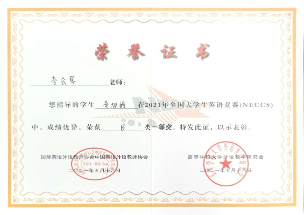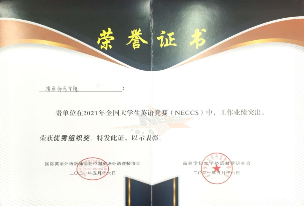 近日,2021年全国大学生英语竞赛(NECCS)决赛成绩揭晓,纽约国际官网师生取得优异成绩。其中,纽约国际官网荣获优秀组织奖,李旭婷等4名同学荣获国家级一等奖,许馨月等21名学生荣获国家级二等奖,李欣蕾等35名学生荣获国家级三等奖,李会琴等29名教师被评为优秀指导教师。