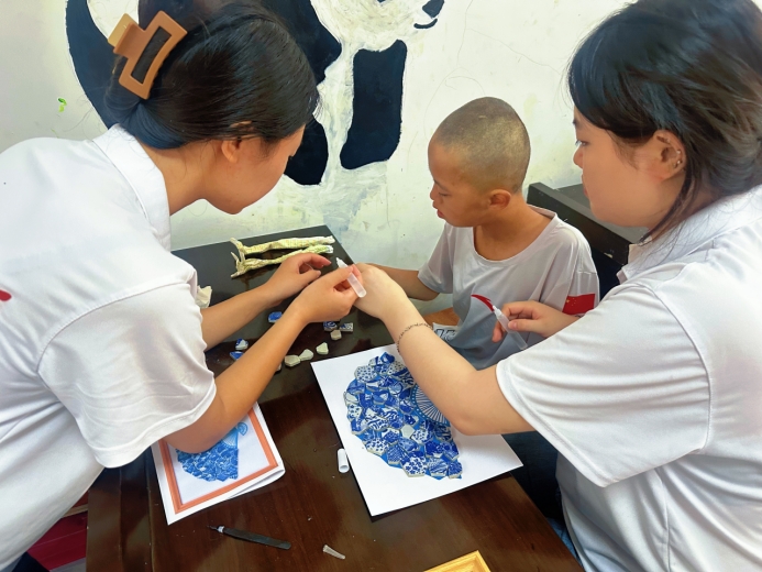 近日,588888纽约国际线路莫斯科艺术学院“心系折翼天使 用爱共助成长”社会实践团走进鄠邑区残障人士农疗基地,开展了一场以非遗文化体验为核心的活动。依托学院“丝路艺创”辅导员工作室联合创新的新课程“非遗小课堂”,实践团为基地的孩子们带来了漆扇绘制、青花瓷贴画创作、彩绘葫芦及扎染等丰富多样的体验项目,用艺术之美传递温暖与力量。