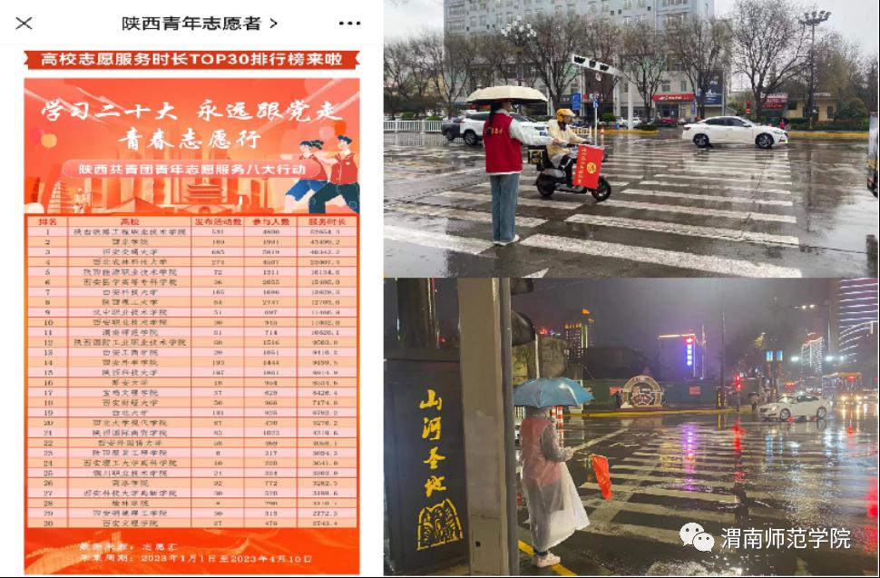 构建学校志愿服务三级体系,成立志愿者突击队,下设“暖风”支教、“白鹭”环保、“筑梦”实践、“阳光”助残志愿组织,学校在全省高校志愿服务时长排名进入到第一方阵。组织大学生志愿者深入渭南市临渭区6个街道的108个社区网格小区,参与全国文明城市创建入户宣传和“文艺轻骑兵进社区”活动,实现了中心城市社区全覆盖。积极配合学校“绿色校园”“文明校园”创建,形成了渭师特色的“志愿服务”。启动爱国主义教育示范工程创建,分别与渭南市10个革命纪念地共建大学生爱国主义教育基地,接受红色教育洗礼,协作开展红色精神和红色文化研究,形成了渭师特色的“爱国教育”。