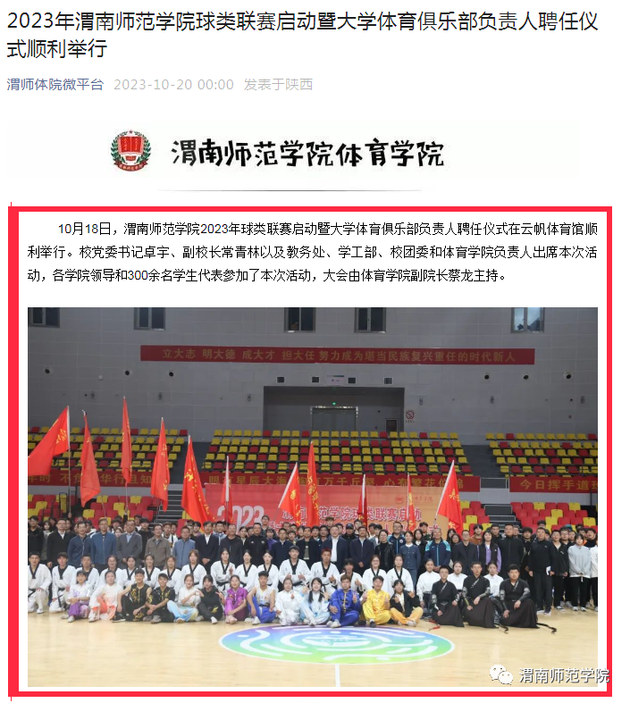 学院以学科建设为龙头,以教育教学改革为抓手,以培养学生全面发展为目标,紧密结合专业特点,进行系列教育教学改革,成立体育俱乐部,通过集体备课、专业提升、理论交流培训、教师素质测试等,提高教师教育教学能力水平,提高人才培养质量。加强体育赛事交流,提高学校影响力。学院积极组织学生参加各级各类赛事活动,通过比赛学习交流,不断激发学生主动学习能力,提高学生专业水平,同时,扩大学校的知名度和影响力。积极开展区域服务,彰显社会担当。学院与渭南市体育局签订合作协议,师生积极参与地方体育赛事活动的组织开展、志愿服务、科学研究等,充分发挥高校服务地方的职能。